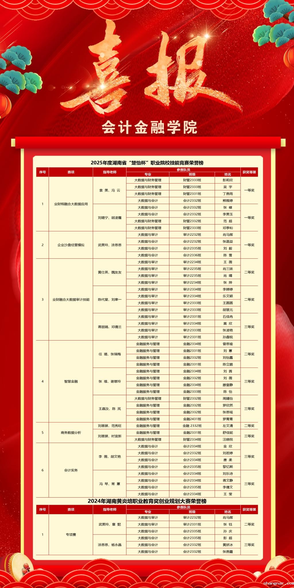 (通讯员 杨永晶)在2025年度“楚怡杯”湖南省职业院校技能竞赛中,会计金融学院师生奋勇拼搏,斩获一等奖三项、二等奖四项、三等奖六项的优异成绩。此外,在2024年湖南黄炎培职业教育奖创业规划大赛中,学院团队也荣获二等奖、三等奖各一项,充分展现了学院在专业技能培养和创新创业教育方面的突出成果。